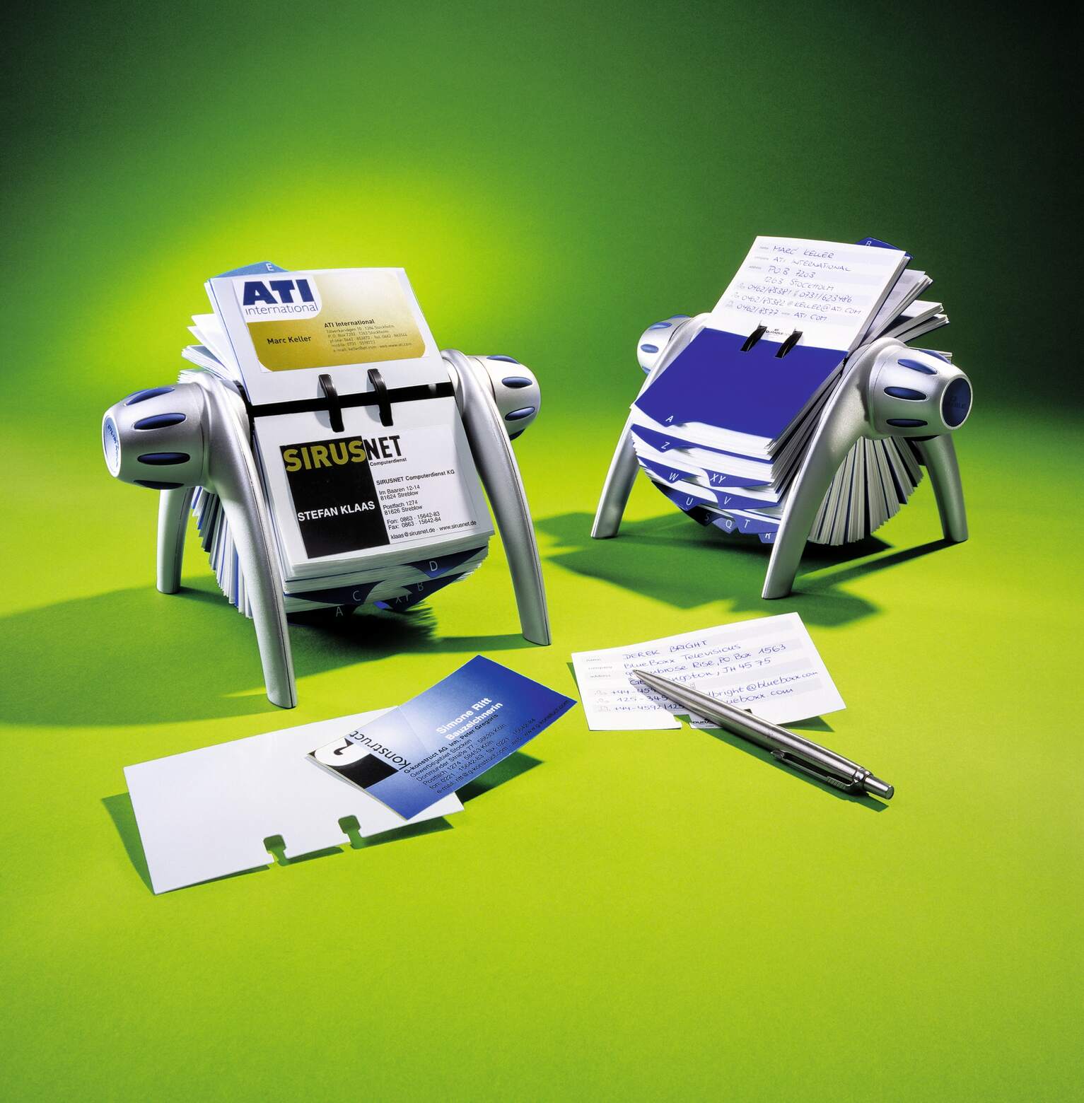 Rotačný vizitkár v exkluzívnom dizajne z plastu v kvalitnej povrchovej úprave. 200 obojstranných vreciek rozmeru 72 × 104 mm pre 400 vizitiek, abecedný rozraďovač s 25 oddielmi. Doplniteľný náhradnými vreckami Obj. kód DU241819.