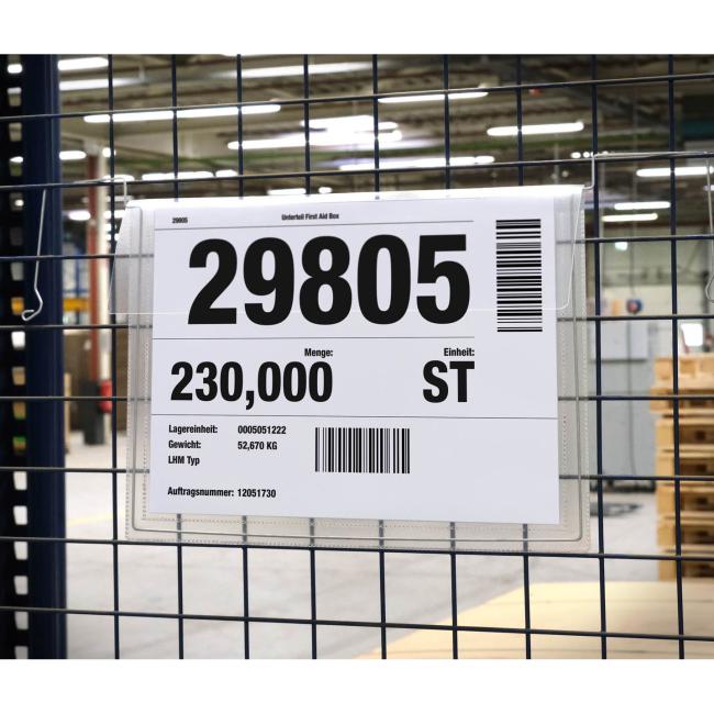 DURABLE závesné vrecko A4, drôtové vrecko na dokumenty, obal na dokumenty s drôtom, vrecko na paletové kartóny, označenie kontajnerov A4, priehľadné vrecko s klapkou, PP fólia na dokumenty, odolné vrecko na transportné nádoby, závesná kapsa A4 landscape.