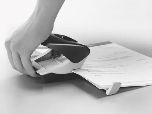Patentovaná zóna pre ľahké vloženie papiera a ostré razníky pre zníženie sily potrebnej na dierovanie