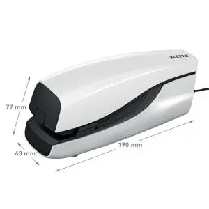 SEO EN: Leitz contactless electric flat clinch stapler, hygienic no-touch stapling, 20-sheet electric stapler, E2 staples included, jam-free performance, flat clinch saves up to 30% file space, mains powered, diagonal stapling, GS certified, 3-year warranty, desktop electric stapler