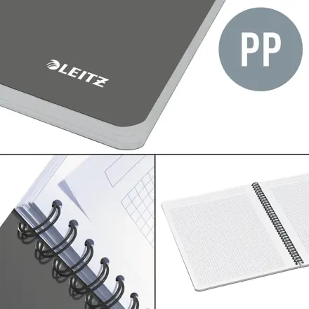 Každý zápisník má 180 strán / 90 listov papiera najvyššej kvality s gramážou 80 g/m2, je viazaný drôtenou väzbou na 360-stupňové otváranie a má plastové (PP) dosky.
