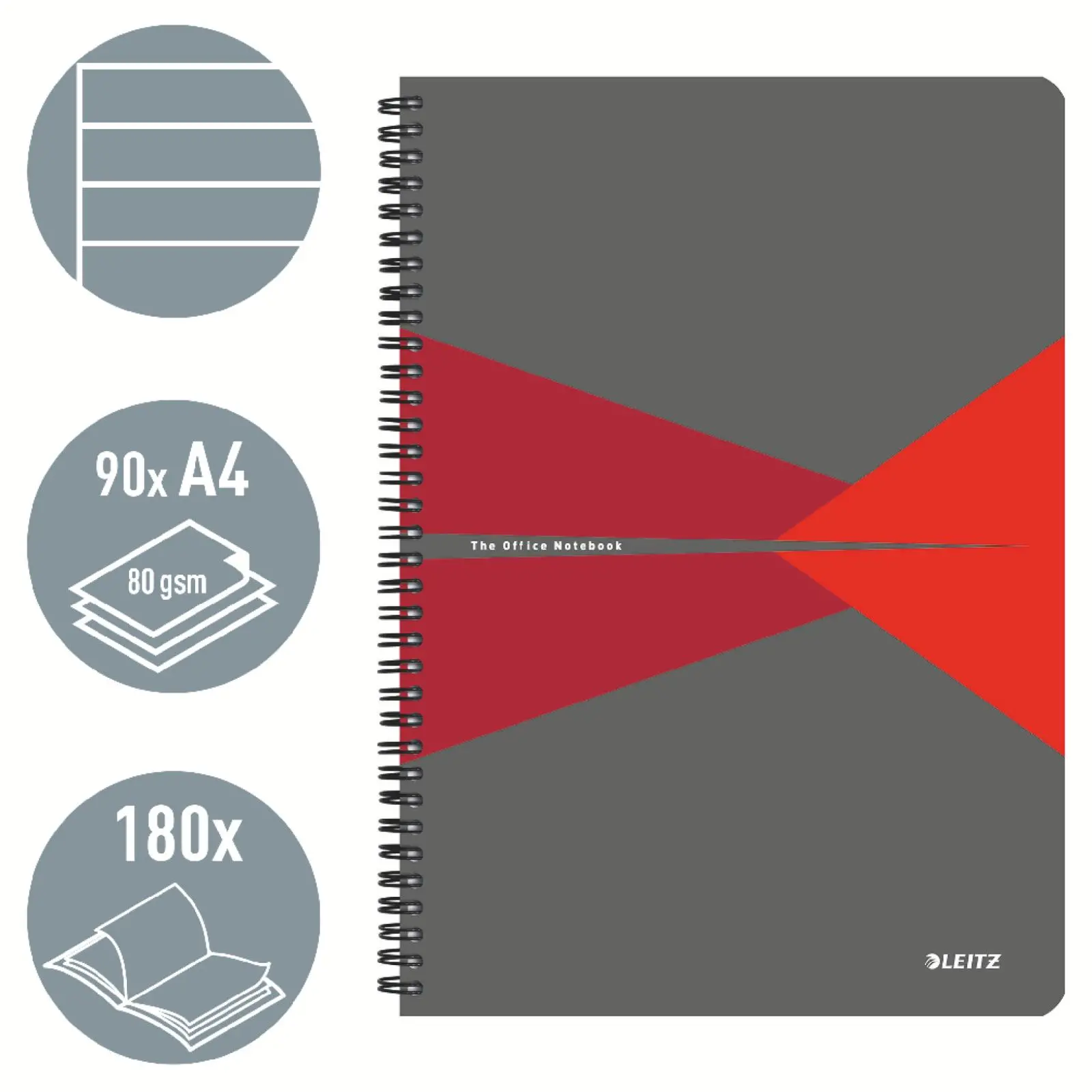 blok Leitz Office Card A4 červený, linajkový zápisník A4, kancelársky poznámkový blok Leitz, špirálový blok s perforáciou, blok na poznámky A4 80 g, FSC papier Leitz, pracovný zápisník do kancelárie