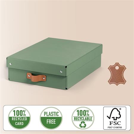 100 % recyklovaný FSC® certifikovaný kartón zabezpečuje udržateľné riešenie pre domácnosť aj kanceláriu – boxy môžete po použití úplne rozobrať a 100 % recyklovať. Prirodzené zemitotónové farby boli inšpirované jednoduchosťou prírody a dokonale zapadnú do každého interiéru. Kožené madlo uľahčuje manipuláciu a vysúvanie z regálov a políc. Vyrobené v Taliansku – spojenie funkčnosti a dizajnu.