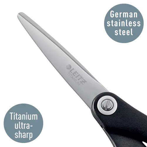SEO EN: Leitz titanium scissors, premium stainless steel scissors, ergonomic non-slip handle, adjustable screw, long-lasting sharpness, office scissors 150 mm, black scissors, precise cutting for paper and fabric, German stainless steel, durable household scissors