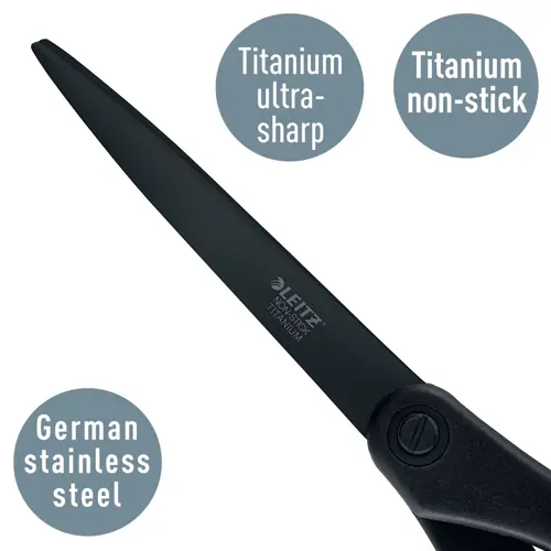 SEO EN: Leitz Titanium Non Stick Scissors 205 mm, titanium & non-stick coated stainless steel blades, ergonomic soft TPR grip, adjustable screw, high precision cutting, right & left handed, 105 mm blade, plastic free hanging card, long lasting sharpness, office & home scissors, black