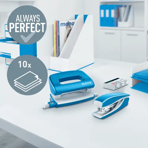 LEITZ Wow Mini zošívačka a dierovačka set 10 listov kovové modré