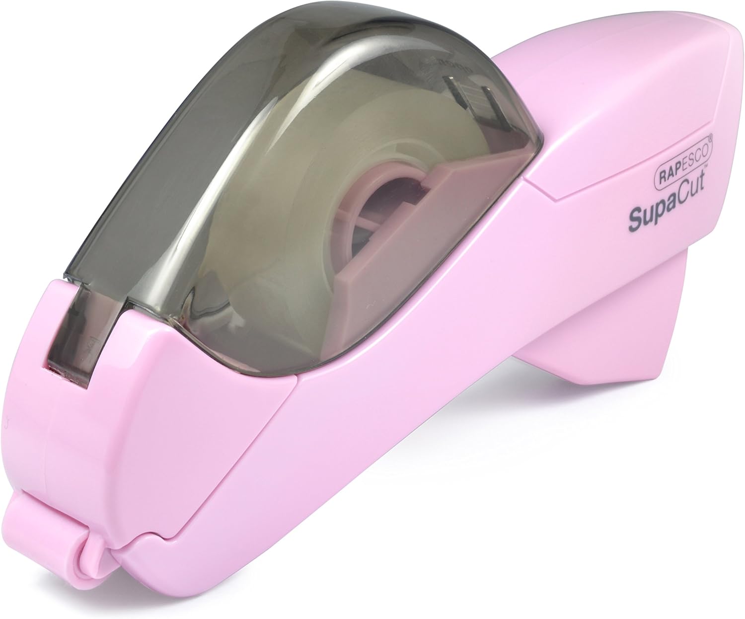RAPESCO SupaCut tape dispenser, pastel pink, automatic tape cutter, handheld dispenser, safe concealed blade, no batteries required, two rolls included 19 mm x 20 m and 12 mm x 20 m, 25 mm core compatible, durable and ergonomic design, school and office tape dispenser, 3-year warranty |