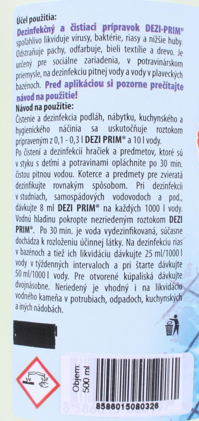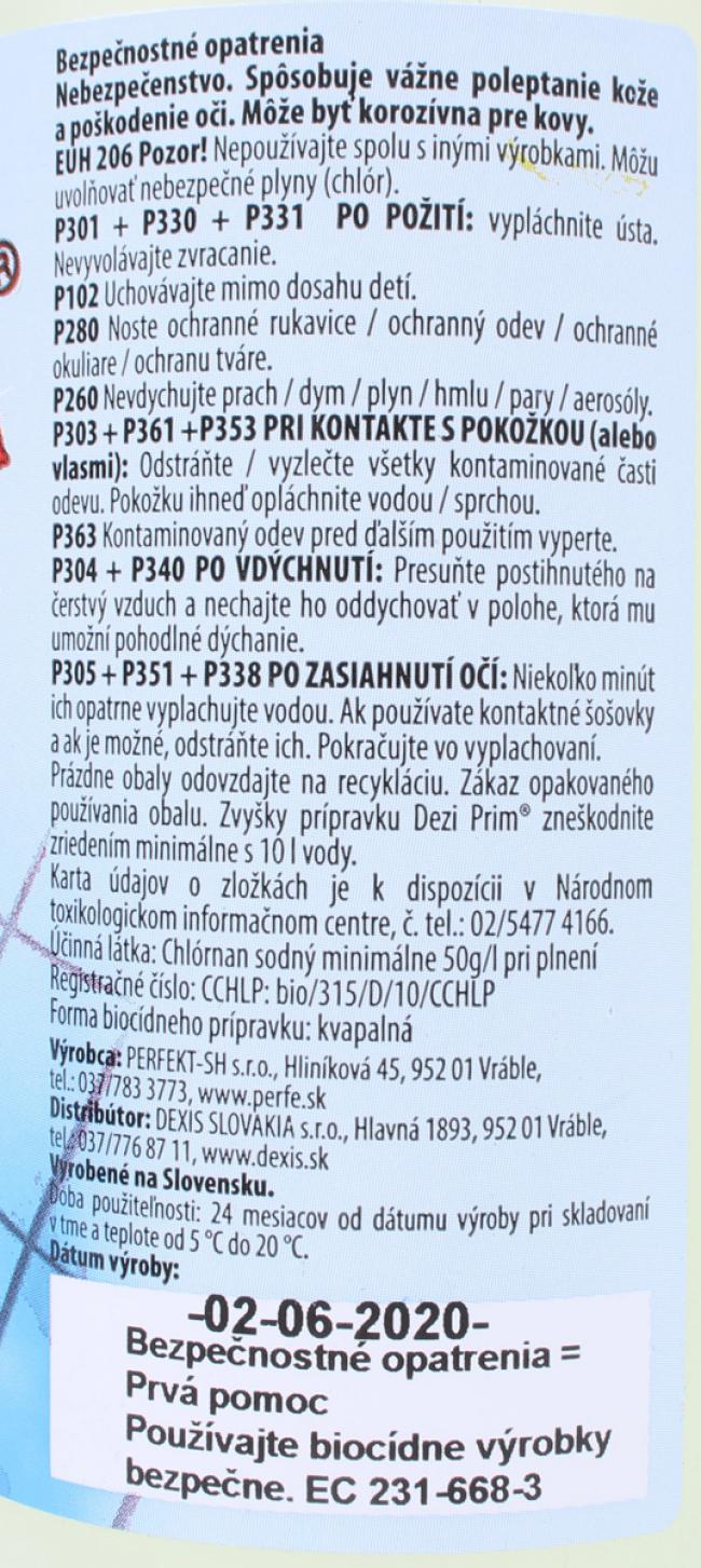 Bezpečnostné informácie Nebezpečenstvo Spôsobuje vážne poleptanie kože a poškodenie očí. Môže byť korozívna pre kovy.EUH 206 Pozor! Nepoužívajte spolu s inými výrobkami. Môžu uvolnovať nebezpečné plyny ( chlór). P102 Uchovávajte mimo dosahu detí.P280 Noste ochranné rukavice/ ochranný odev/ ochranné okuliare/ ochranu tváreP301+P330+P331 PO POŽITÍ: vypláchnite ústa. Nevyvolávajte vracanieP303+P361+P353 PRI KONTAKTE S POKOŽKOU (alebo vlasmi): Odstráňte/ vyzlečte všetky kontaminované časti odevu. Pokožku ihneď opláchnite vodou/ sprchou.P304+P340 PO VDÝCHNUTÍ: Presuňte postihnutúho na čerstvý vzduch a nechajte ho oddychovať v polohe, ktorá umožní pohodlné dýchanie.P305+P351+P338 PO ZASIAHNUTÍ DO OČÍ: Niekoľko minúť ich opatrne vyplachujte vodou. Ak použivate kontaktné šošovky a ak je to možné, odstráňte ich. Pokračujte vo vyplachovaní.P363 Kontaminovaný odev pred ďalším použitím vyperte. Výrobca PERFEKT-SH s.r.o. Vráble Meno alebo obchodné meno a adresa distribútora DEXIS SLOVAKIA, Vráble Návod na použitie Čistenie a dezinfekcia podláh, nábytku, kuchynského a hygienického náčinia sa uskutočňuje roztokom pripraveným z 0,1-03 l DEZI PRIM a 10 l vody. Po čistení a dezinfekcii hračiek a predmetov, ktoré sú v styku s deťmi a potravinami opláchnite po 30 minútach čistou pitnou vodou. Koterce a predmety pre zvieratá dezinfikujte rovnakým spôsobom. Pri dezinfekcii v studniach, samospádových vodovodoch a pod. dávkujte 8 ml DEZI PRIM na každých 1000 l vody. Vodnú hladinu pokropte nezriedeným roztokom DEZI PRIM. Po 30 minútach je voda vydezinfikovaná, súčasne dochádza k rozloženiu účinnej látky. Na dezinfekciu rias v bazénoch a tiež ich likvidáciu dávkujte 25ml/ 1000 l vody v týždenných intervaloch a pri štarte dávkujte 50 ml/ 1000l vody. Pre otvorené kúpaliská dávkujte dvojnásobne. Neriedený je vhodný i na likvidáciu vodného kameňa v potrubiach, odpadoch, kuchynských a iných nádobách. Dátum minimálnej trvanlivosti spotreby Spotrebujte do 24 mesiacov od dátumu výroby.