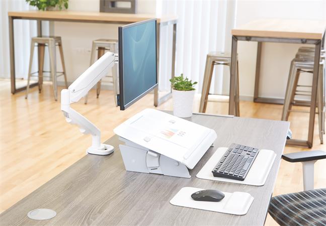 Eppa™ Single Monitor Arm v bielom prevedení prináša plynulý pohyb a maximálny komfort pri práci
