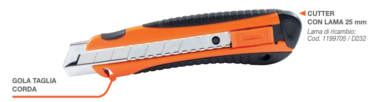 retraktabilný cutter, nôž na šnúry, GOLA TAGLIA CORDA, bimateriálový nôž, bezpečnostný odlamovací nôž, výmenné čepele, cutter so zásobníkom čepelí, vodiaca lišta na nôž, univerzálny pracovný nôž