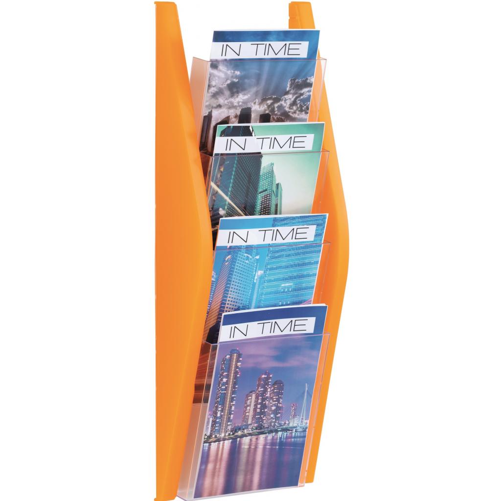 Nástenný stojan na prezentáciu materiálov. Štyri priehľadné priehradky slúžia na umiestnenie materiálov formátu A5. Materiál kvalitný plast. Rozmery (š x v x h) 215 x 540 x 80 mm.