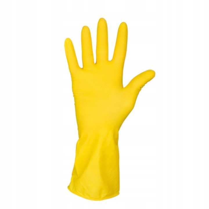 EN: Mercator Yellow household latex gloves size XL – protective textured rubber gloves for home use, food-safe, non-powdered, soft and flexible, with long cuff for forearm protection. Ideal for cleaning, kitchen, garden and household work.