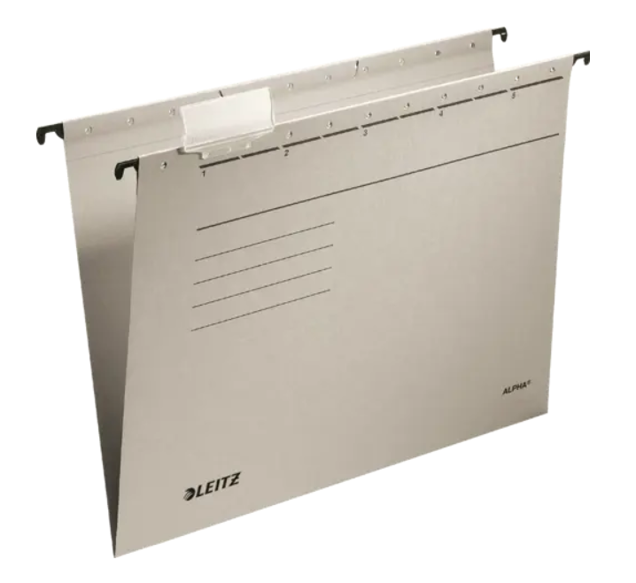 Leitz ALPHA V suspension files grey, A4 hanging files open sides, strong suspension rails, index tab with replaceable label, cut-outs for prong fastener, FSC certified filing supplies, office organisation, olhaoffice