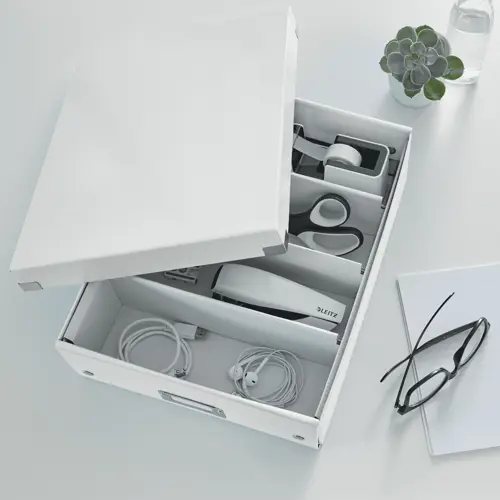 Nezáleží, či si poriadkumilovný gazda, kreatívna duša alebo pracant od stola – táto stredná Leitz WOW krabica ťa nesklame. Pomôže ti udržať si poriadok a vytvoriť pekné, čisté a šikovne zorganizované miesto – doma, v kancelárii, na poličke alebo v šuplíku.