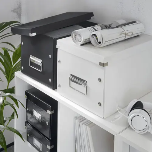 Kockový dizajn ponúka extra kapacitu. Ideálny na uloženie vysokých alebo okrúhlych predmetov. Perfektne pasuje do štandardného policového nábytku s kockami (napr. Kallax od Ikea). Vyrobená z pevného, prémiového kartónu z recyklovaných zdrojov. Laminovaný povrch a kovové rohy poskytujú vysokú ochranu. Pevné kovové držadlá umožňujú jednoduché prenášanie. Krabica je skladacia, takže ušetrí miesto, keď ju práve nepotrebuješ. Moderný vzhľad skvele zapadne do každej kancelárie. Objem 30 litrov.