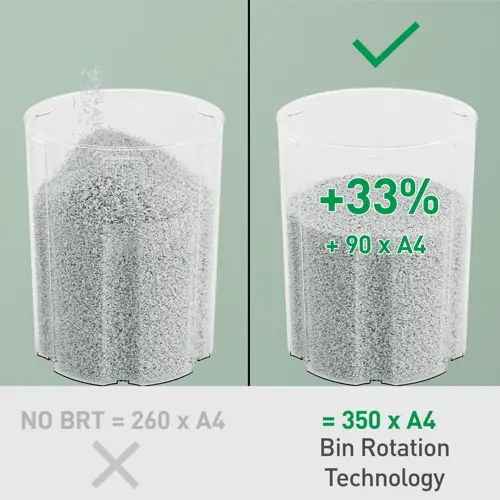Vďaka tomu je možné skartovať až 350 listov A4 pred nutnosťou vyprázdnenia koša