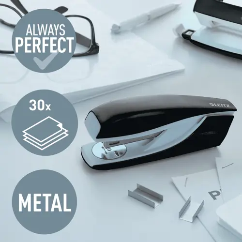 SEO EN: Leitz NeXXt WOW metal stapler, 30 sheet stapler, Direct Impact Technology, P3 24/6 26/6, top loading, tacking function, open/closed stapling, integrated staple remover, GS certified, office stapler, WOW colours, robust reliable stapler