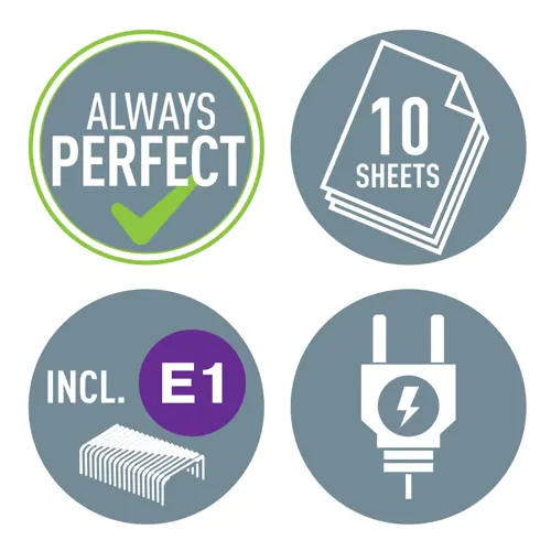 Rýchle a beznámahové zošívanie. Ideálna na časté používanie. Hygienické zošívanie vďaka bezkontaktnému používaniu – zošívačky sa nemusíte dotýkať, čo zvyšuje ochranu. Vysoký výkon. Sponky Leitz Electric E1 zabezpečia vždy perfektné a bez zasekávania.