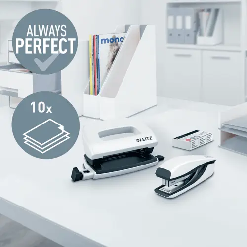 SEO EN: Leitz WOW mini stapler and hole punch set, compact 10-sheet stapler, P2 No.10 staples included, ergonomic mini stapler, handheld hole punch with guide bar, 180° opening tacking, GS certified, 10-year guarantee, office school travel set, desktop stationery, color-agnostic