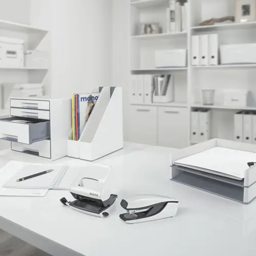 LEITZ Wow Mini zošívačka a dierovačka set 10 listov kovové biele