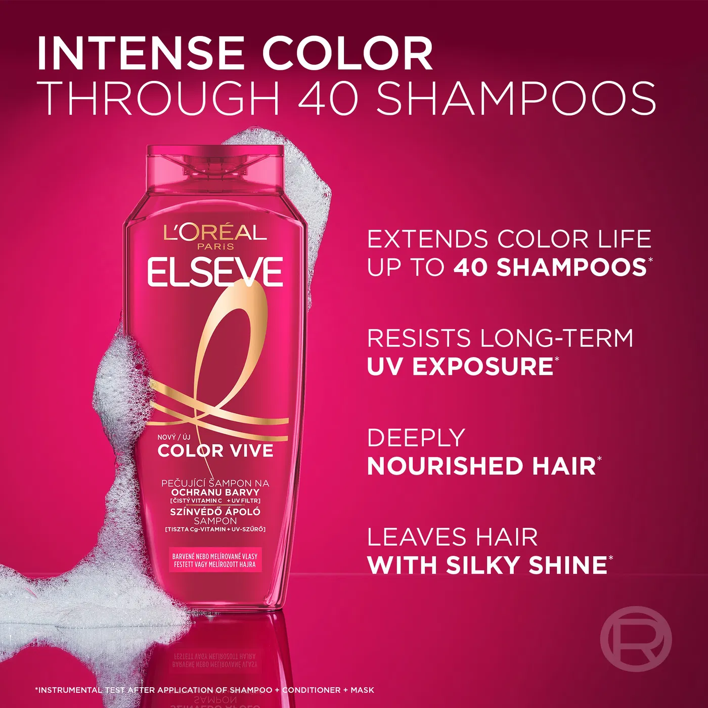 Šampón L'ORÉAL ELSEVE Color Vive bol špeciálne vyvinutý pre starostlivosť o farbené a melírované vlasy. Jeho zloženie obohatené o špeciálny elixír zvyšuje žiarivosť farby a predlžuje jej trvácnosť. Vďaka obsahu UVA/UVB filtrov chráni vlasové vlákno pred slnečným žiarením, zatiaľ čo výživné látky zabezpečujú hĺbkovú hydratáciu a hebkosť vlasov. Šampón neobsahuje silikóny a je šetrný k vlasom i pokožke hlavy.