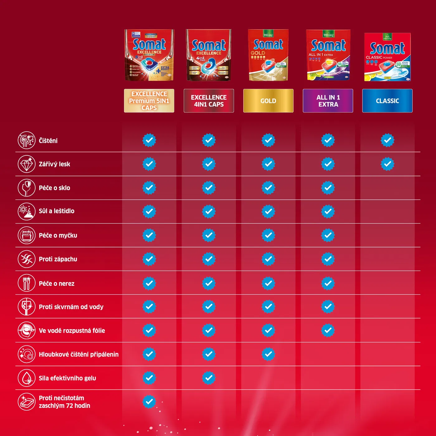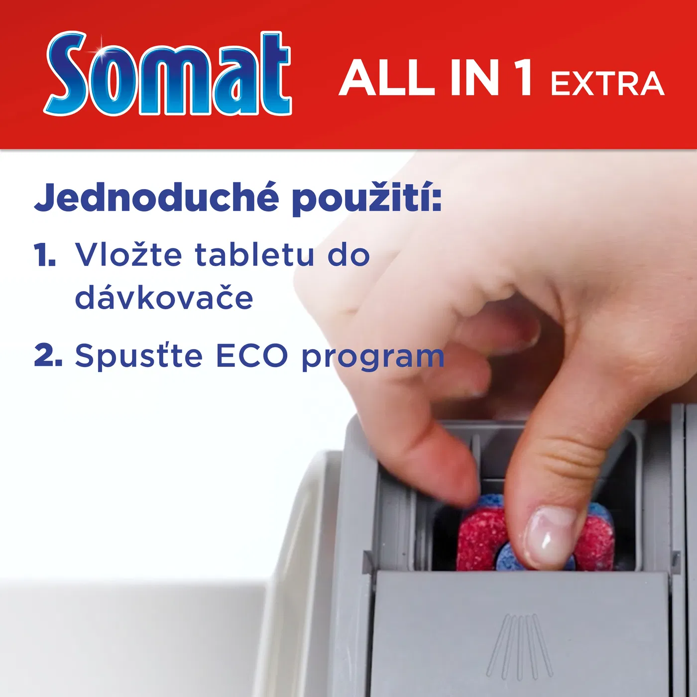 Tablety do umývačky riadu Somat All-in-1 Extra neutralizujú zápach a zaručujú dokonale čistý riad aj pri krátkych a ekologických programoch s nízkou teplotou. Ich účinné a rýchlo pôsobiace zloženie si poradí so zaschnutými zvyškami jedla aj so škvrnami od kávy či čaju.