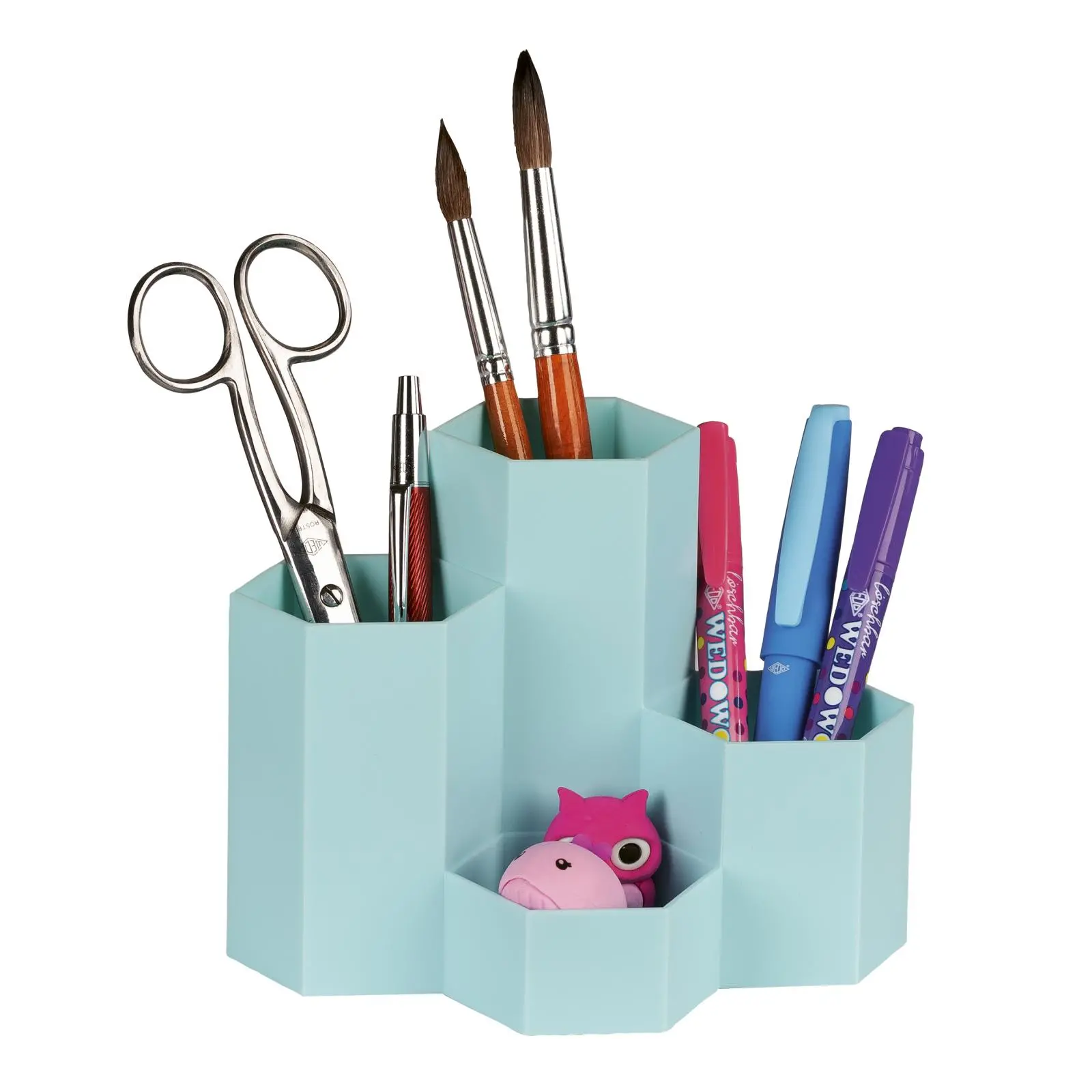 Praktický stojan na perá značky Werner Dorsch GmbH je vyrobený z vysoko odolného a nárazuvzdorného polypropylénu. Jeho šesťuholníkový dizajn v štýle včelieho plástu umožňuje efektívne zoskupovanie viacerých stojanov vedľa seba a šetrí tak miesto na stole.